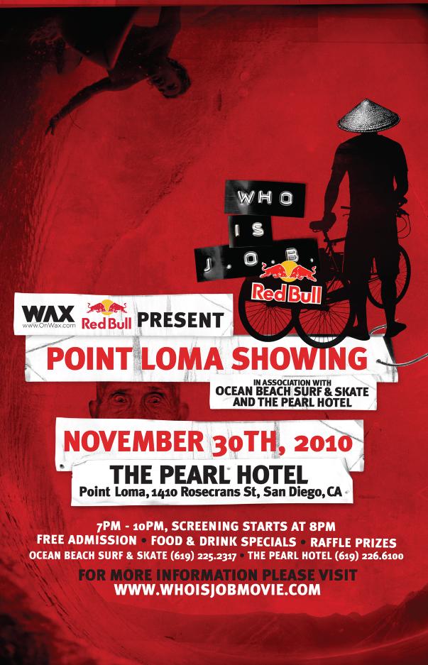 Join Ocean Beach Surf and Skate for the Point Loma showing of Jamie O’Brien’s latest film, Who is J.O.B. at The Pearl Hotel. The Surf on the Silver Screen event will be held on Tuesday, November 30, 2010 from 7:00 p.m. to 10:00 p.m., with the premier beginning at 8:00 p.m.